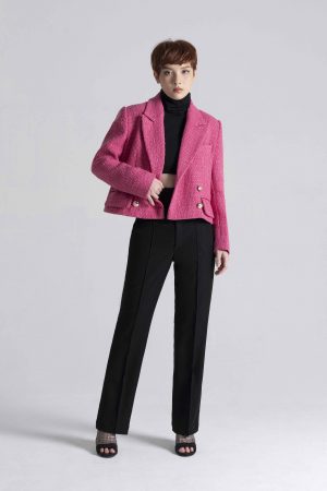 Fresh blue tweed blazer & White trousers & Body fit sweater