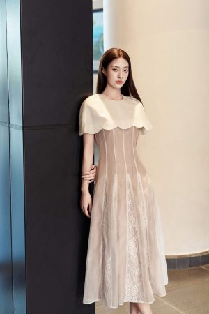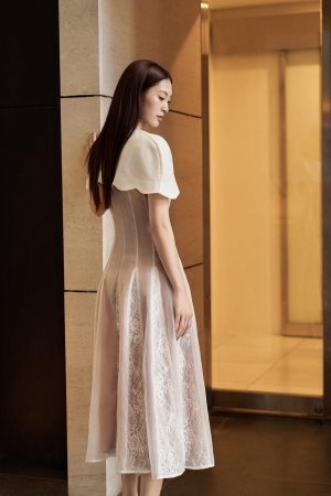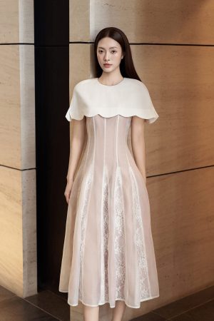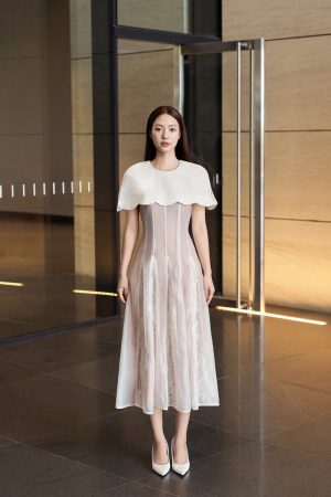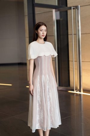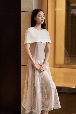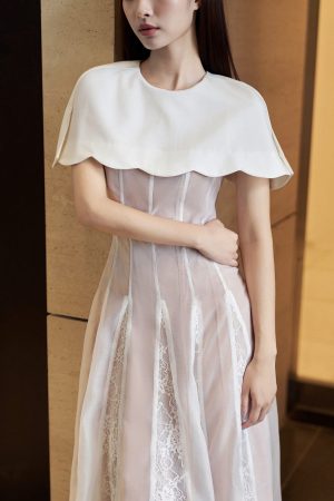 Những đường cắt được tính toán để tối ưu vẻ đẹp đường cong của người phụ nữ. Phần trên giống như một áo choàng cape, xóa đi sự tự ti vùng bắp tay của người mặc,. Đầm màu trắng sử dụng lót bên trong màu nude, mục đích tạo hiệu ứng trong suốt của chất liệu organza và ren mỏng, mang tới cảm giác tinh tế và thanh lịch. Những từ mà có thể cảm nhận ở điểm chạm thị giác đầu tiên cảu mẫu đầm này là elegant, fashionable, sophisticated, premium.