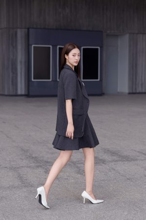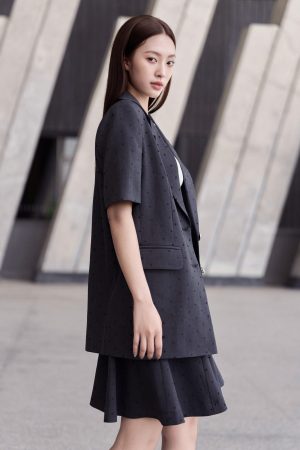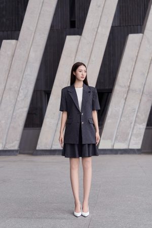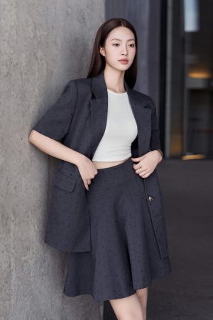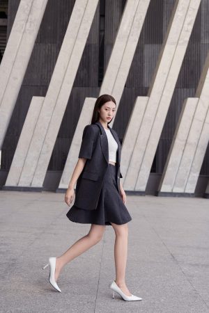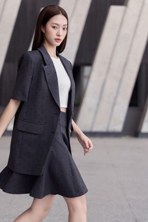 Thiết kế này không bị gò bó bởi những quy tắc truyền thống của bộ suit thông thường. Style được hướng đến sự đơn giản, thoải mái, phóng khoáng và thanh lịch. Áo blazer dáng tay ngắn, form rộng kết hợp với chân váy dáng xòe múi, outfit này ưu tiên sự thoải mái, giải phóng người phụ nữ khỏi những chân váy bút chì bó dài, những chiếc quần âu ngột ngạt. Free woman’s body vẫn luôn là điều mà thời trang hiện đại muốn hướng tới.