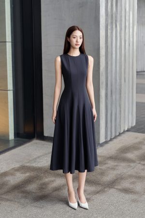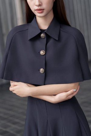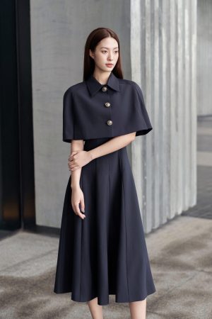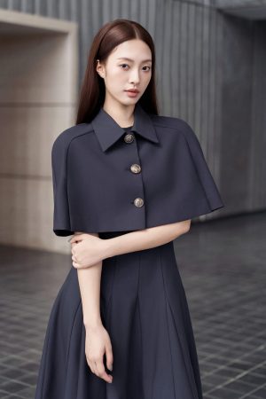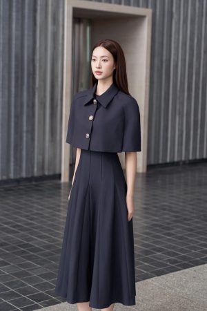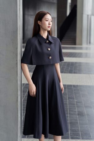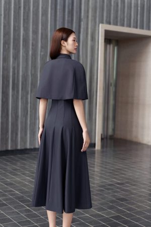 Set bao gồm đầm dáng midi xòe mặc cùng với áo choàng cape dáng ngắn. Vẫn duy trì tỷ lệ cấu trúc trang phục giai đoạn này, phần áo ngắn để tạo cảm giác tăng chiều dài của chân. Dáng váy midi vẫn được lựa chọn lấy cảm hứng từ trào lưu xa xỉ thầm lặng, hạn chế phô trương nhiều phần cơ thể. Màu sắc độc đáo này có tên gọi là midnight grey- màu xám đêm. Màu này mang theo hiệu ứng sang trọng của đen, sự quyết đoán, thâm trầm và tính bền vững của màu xám, toát lên phong thái trầm ổn, mạnh mẽ và sâu sắc